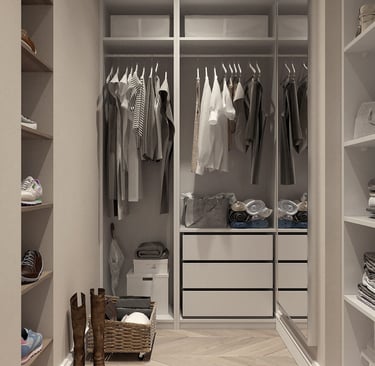 Avec un dressing conçu selon vos besoins, vous pouvez définir vos priorités : plus d’étagères pour les vêtements pliés, de grands espaces pour les robes et manteaux, ou encore des tiroirs spécifiques pour les accessoires et chaussures. Résultat : un rangement optimisé, clair et pratique au quotidien.